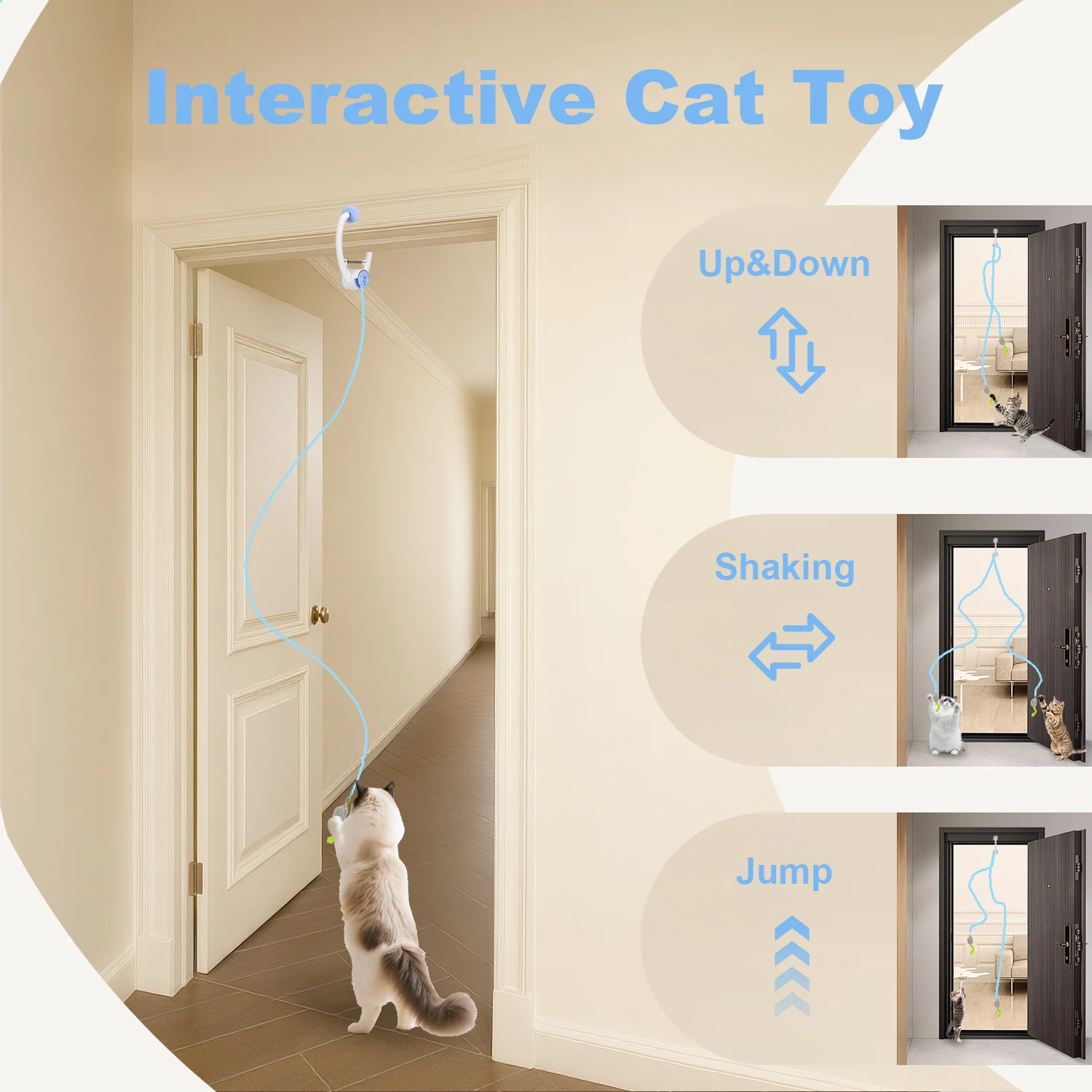 Electric USB rechargeable door hanging cat toy with retractable interactive movement. Ideal for kittens and indoor cats needing solo play.
