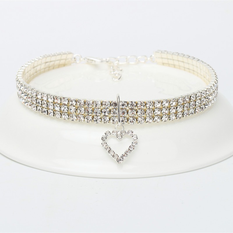This elegant three-row rhinestone collar features sparkling love-heart decorations that catch the light and turn every walk into a fashion moment. The elastic design stretches gently for a comfortable, secure fit that never restricts movement. Available in four colors and three sizes — a true pet jewelry necklace and luxury cat collar that makes your pet look absolutely stunning.