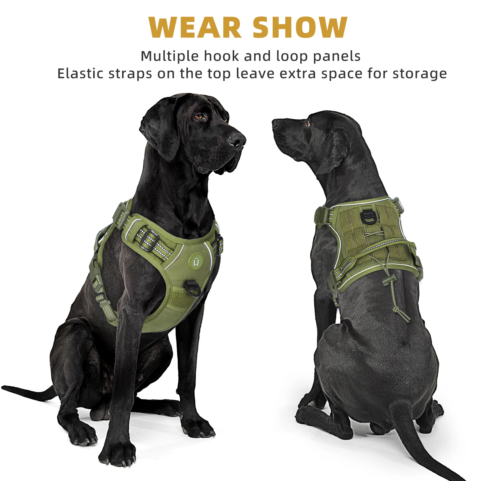 The MOLLE attachment system across the vest allows you to add pouches, patches, and accessories for any mission — from hiking and tracking to service dog work and everyday training. The no-pull design redirects leash pressure to the chest for calm, confident control, and the breathable construction keeps your dog comfortable through long sessions. Adjustable from M to XL in four military-inspired colorways including army green, dark khaki, and light grey.